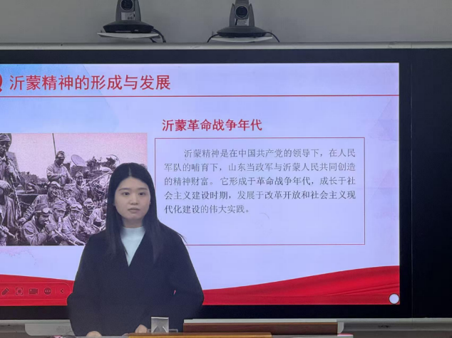 课上,付亚男老师围绕沂蒙精神的核心内涵、发展脉络、典型典范与时代价值四大维度展开系统解读。她强调,沂蒙精神作为中华民族精神谱系的重要组成,凝聚着革命年代党和军队与人民群众生死与共、水乳交融的磅礴力量,对新时代青年坚定理想信念、勇担时代使命具有不可替代的指引作用。从沂蒙精神“爱党爱国、开拓奋进、无私奉献”的精神内核,到革命时期临沂群众以粮草物资全力支援前线的鱼水深情;从“临沂六姐妹”牵头组织妇女昼夜赶制军鞋、筹集粮草保障后勤的坚守,到李桂芳等32名妇女寒冬赤足肩扛门板搭建“人桥”助力渡河的壮举——付亚男老师以一个个鲜活可感的革命故事,让同学们直观触摸到沂蒙精神的历史厚重与精神温度。