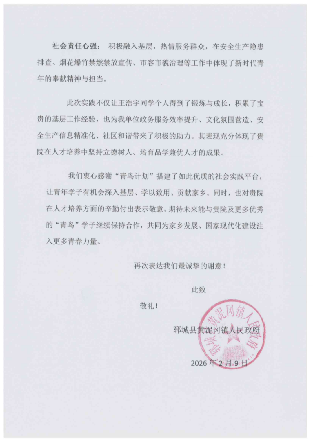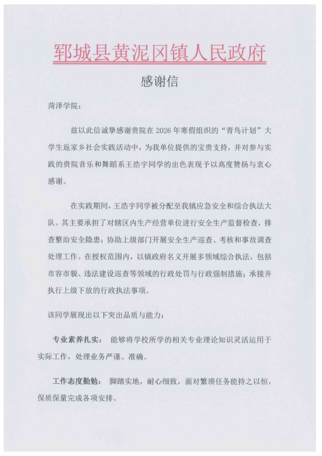 实践感悟:寒假期间,我通过“青鸟计划” 在郓城县武安镇政府文秘岗开展实践工作,彻底改变了对文秘工作的认知,深知文件格式、文字表达的严谨性直接影响政策传达与工作效率。在前辈指导下,我熟练掌握档案归档、公文排版等技能,还参与乡村振兴材料撰写、会议纪要整理、政策单页校对等工作,真切体会到基层行政工作的严谨与责任。这段经历让我看到基层干部的付出,提升了自身能力,更唤醒了我对家乡的责任感。未来,我愿以专业能力为家乡基层治理贡献青春力量。