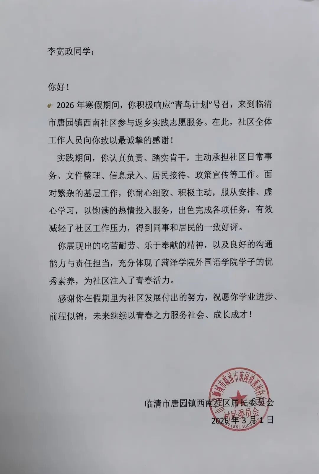 实践感悟:我参与青鸟计划志愿下乡,在聊城市临清市唐园镇西南社区实践,收获颇丰。在社区工作人员指导下,我协助整理居民信息台账,跟随网格员走访民情,参与为独居老人送年货等活动。这些工作让我体会到基层工作的责任与温度,理解了“从群众中来,到群众中去”的意义,锻炼了沟通协调能力。作为商务英语专业学生,我也思考如何用英语宣传助力农产品外销。此次实践让我走出校园、贴近基层,未来我将继续以志愿行动助力乡村振兴。
