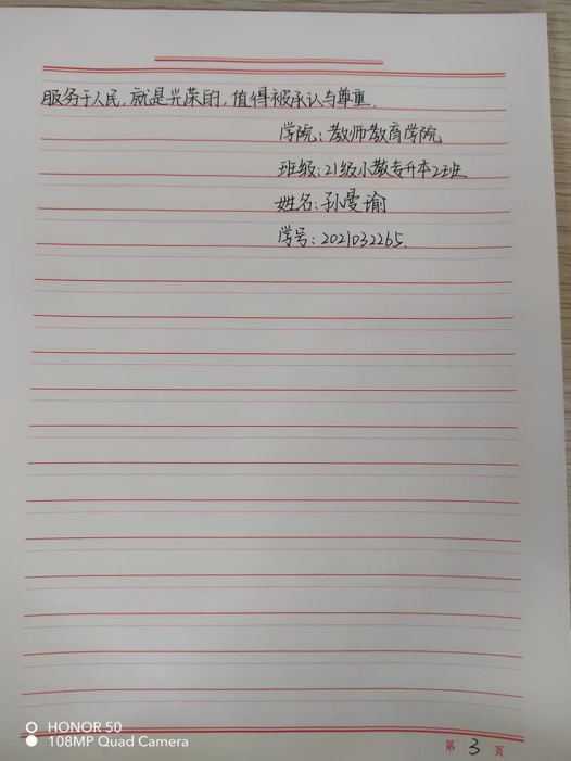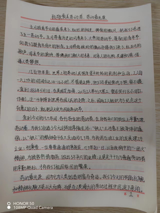 本次主题征文活动收到了广泛的投稿,同学们运用所学诗句,根据主题进行写作创作。其中,2021级小学教育专业专升本二班孙曼瑜学习身边的榜样,用质朴的语言诉说着普通劳动者的故事,将一篇致敬劳动者的征文呈现在大家面前,抒发了对劳动者的敬佩之情。2021级小学教育专业专升本一班的高亦冉,一句“劳动是财富的源泉、是幸福的源泉”,激发了同学们对生活的热爱,展现了劳动青春的魅力。
