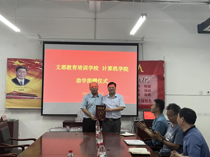 6月2日,文都教育培训学校向计算机学院进行爱心助学捐赠,捐赠仪式在综合实验楼W422举行。文都教育培训学校校长李由军、教师张建伟,菏泽学院合作发展处处长王广峰、教育基金科科长陈文军,计算机学院党委书记王慧丽、院长黄复贤、党委副书记陆纯子、副院长杨青雷、党政办公室主任王夙娟、副教授李进明博士及部分学生代表参加捐赠仪式。