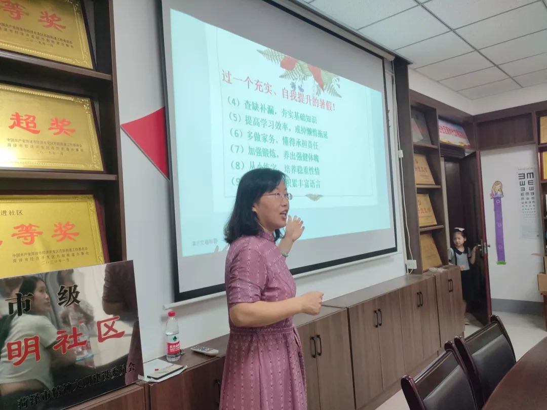 为大力弘扬社会主义家庭文明新风尚,普及科学的家庭教育知识和方法,为孩子的健康成长提供良好的家庭环境。外国语学院李瑜老师作为菏泽市妇联“小红扣”家庭教育志愿服务团成员,于7月10日来到鲁西新区芦庄社区,她以《中华人民共和国家庭教育促进法》为依据,以《如何陪伴孩子度过一个充实而有意义的暑假》为主题进行了家庭教育讲座,社区的党委书记、妇联主任、社区志愿者及家长们近40人参加。