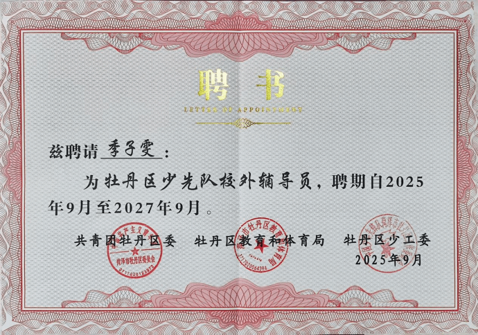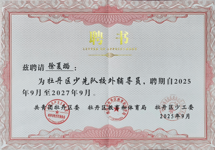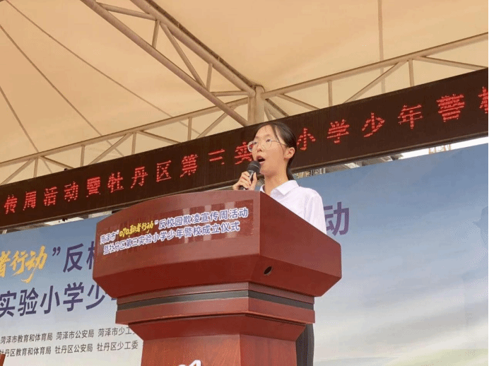 活动中,“法苑星空”志愿服务队成员,政法学院2024级知识产权专业徐夏璐、季子雯被共青团牡丹区委聘为“牡丹区少先队校外辅导员”。今后,她们将充分发挥专业优势,面向少年警校学员及广大学生开展法律知识普及、心理健康辅导和预防欺凌策略指导等工作,助力营造安全、健康的校园环境。