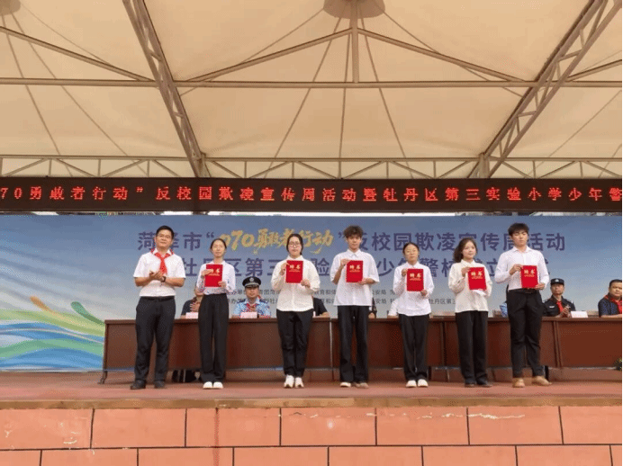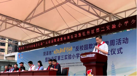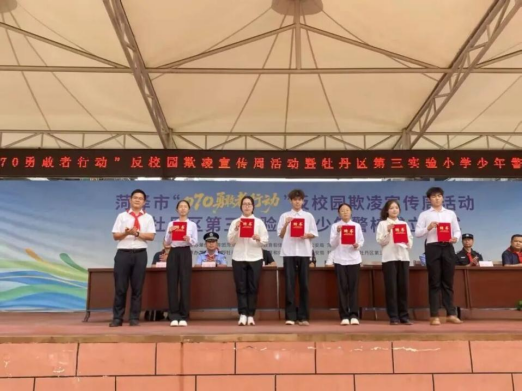 9月12日下午,菏泽市“070勇敢者行动”反校园欺凌宣传周活动暨牡丹区第三实验小学少年警校启动仪式举行。活动由团市委、市教育和体育局、市公安局、市少工委共同主办,牡丹区相关部门承办,菏泽学院政法学院“法苑星空”志愿服务队应邀参加活动。