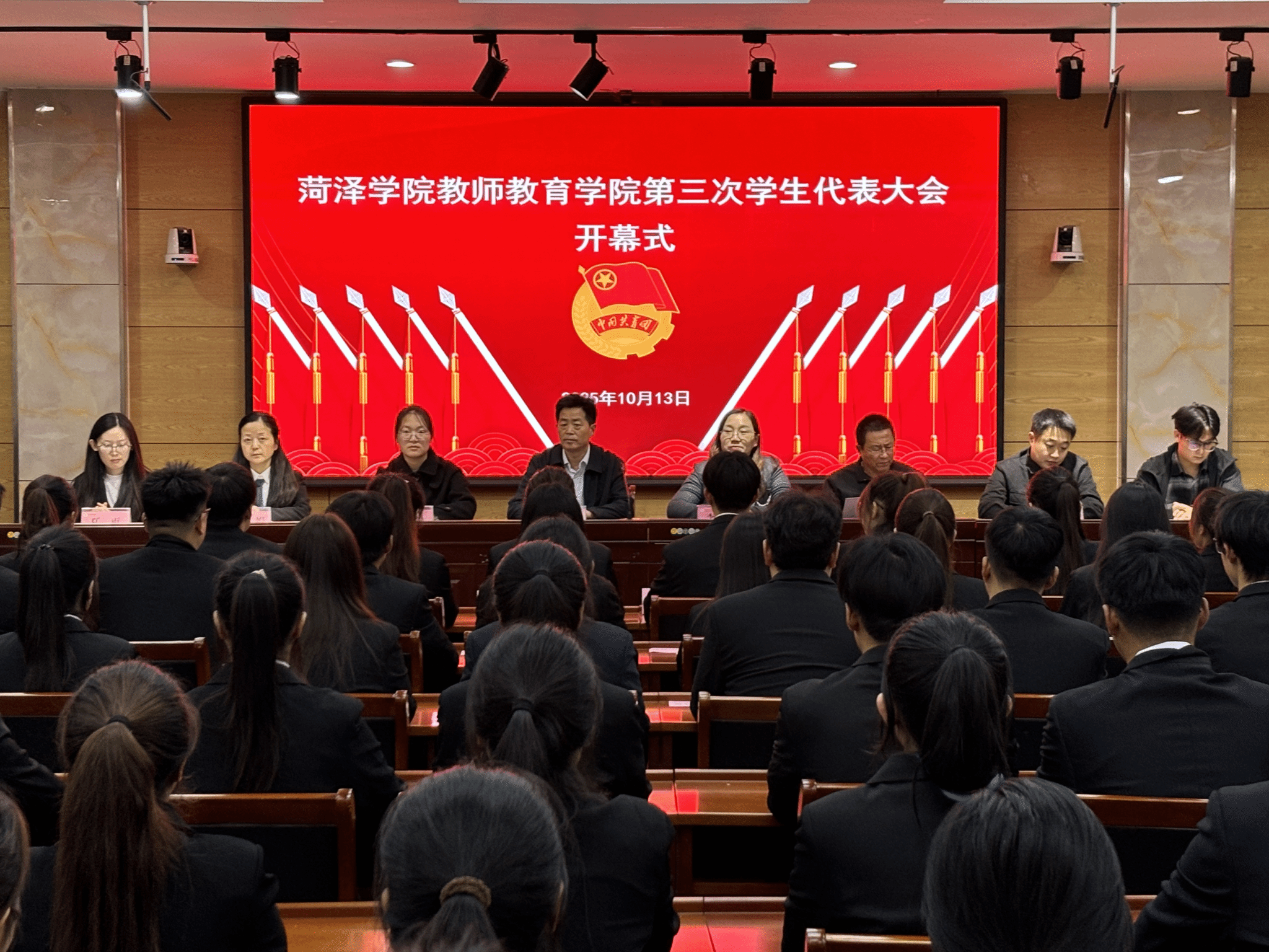 10月13日下午,菏泽学院教师教育学院第三次学生代表大会在教师教育博物馆108室召开,教师教育学院党委书记王永中、党委副书记李婷、团委副书记岳金笛、学工办副主任李怡、辅导员吴培启、各学院主席团代表、各校组织主席团代表及各位正式代表参加会议。