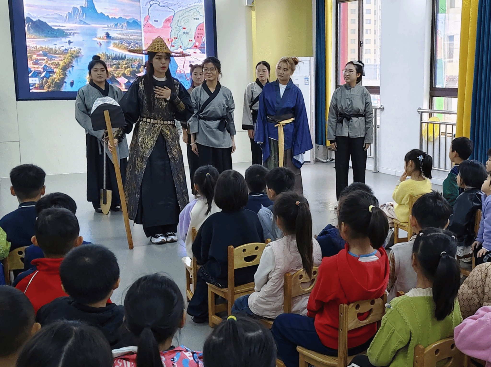 活动中,教师教育学院学生倾情演绎了浸润式教育戏剧《大禹治水》。教师教育学院的学生们以栩栩如生的表演、逼真的道具和充满情感的台词,将大禹带领人民治理洪水、拯救苍生的动人故事精彩呈现。孩子们聚精会神地观看着这场演出,时而因大禹与家人分别的离情而伤感,时而又为大禹的聪明与勇敢而欢欣鼓舞。演出圆满结束后,团队还精心安排了多种有趣互动游戏。小朋友们踊跃参与,在轻松愉快的气氛中,体验了“割麦子”、“治水”等模拟游戏,并学习了《大禹治水》儿歌。这场沉浸式的戏剧体验不仅让孩子们直观地了解了中国古代的治水传奇,更深刻地让他们感受到了先民们团结协作、勇往直前的精神风貌,在他们幼小的心灵中种下了继承黄河精神、传承中华优秀传统文化的种子。