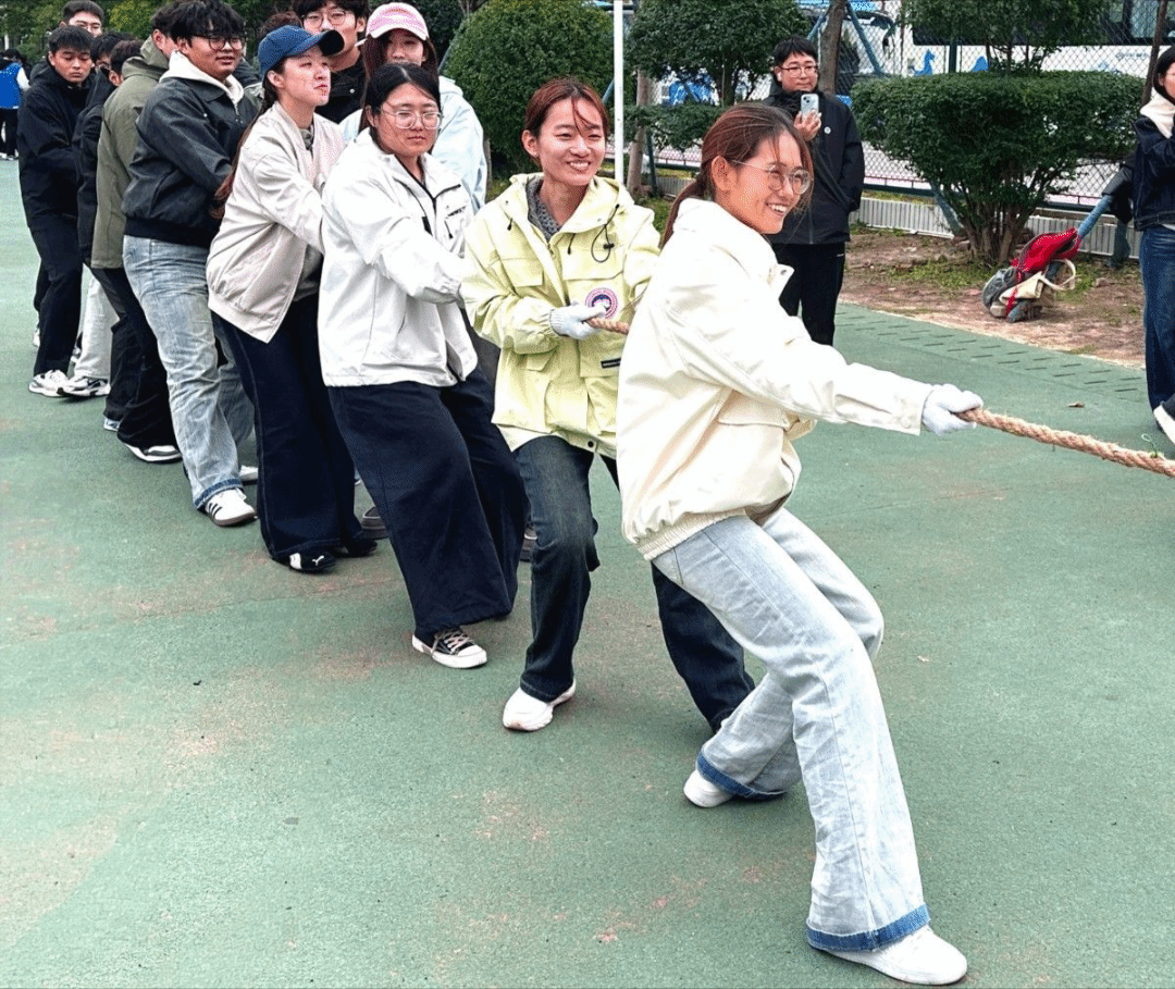 比赛现场,音乐与舞蹈学院参赛队员按照赛前制定的战术方案整齐列队,双手紧握长绳,身体后倾形成稳固的发力阵型。随着裁判哨声响起,队员们齐心协力,喊着整齐的号子稳步后拉,展现出强劲的协作力量。场外,学生们的助威声、呐喊声此起彼伏,形成热烈的竞技氛围。