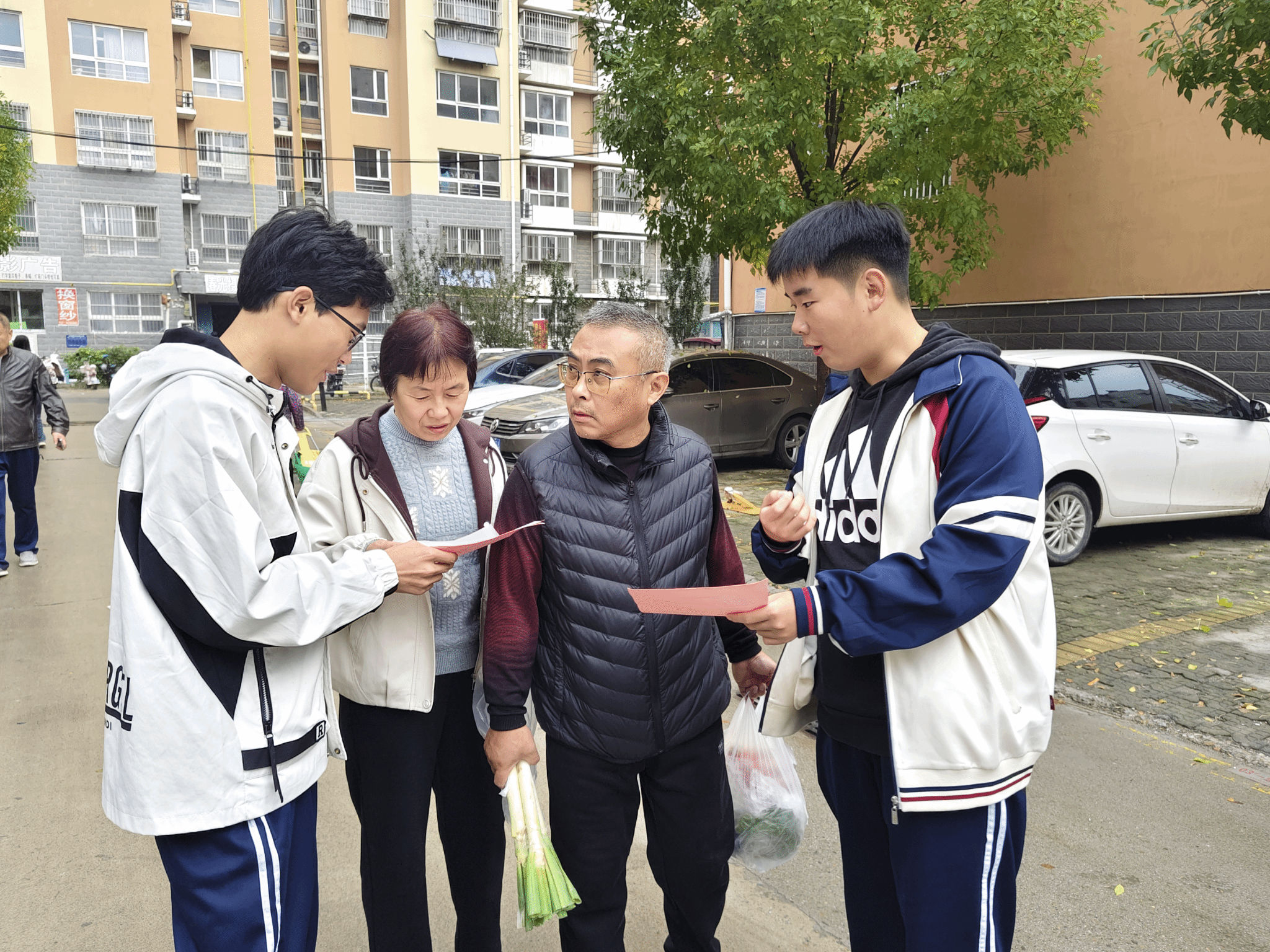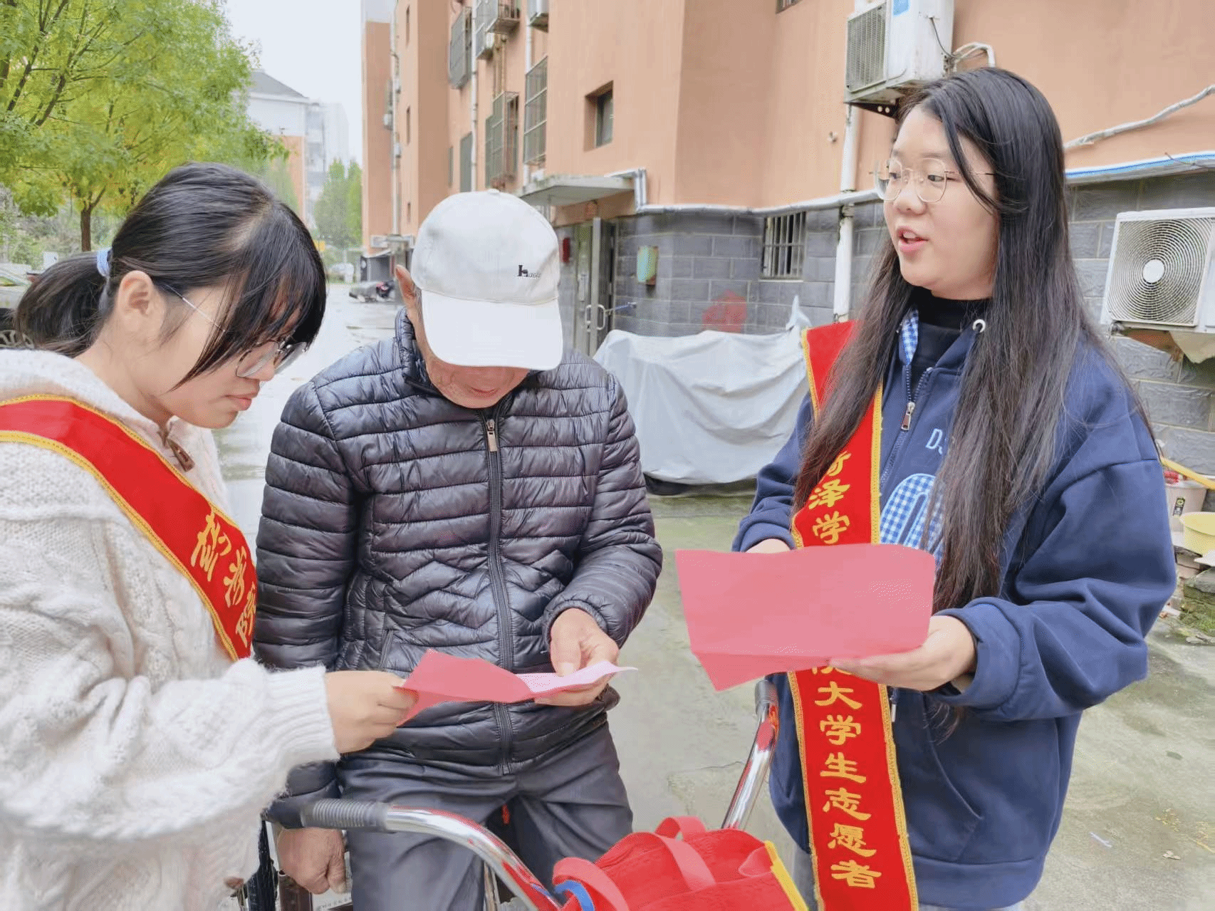 活动现场,身着红色马甲的大学生志愿者分工明确、服务热情,围绕居民实际需求提供多项贴心服务。