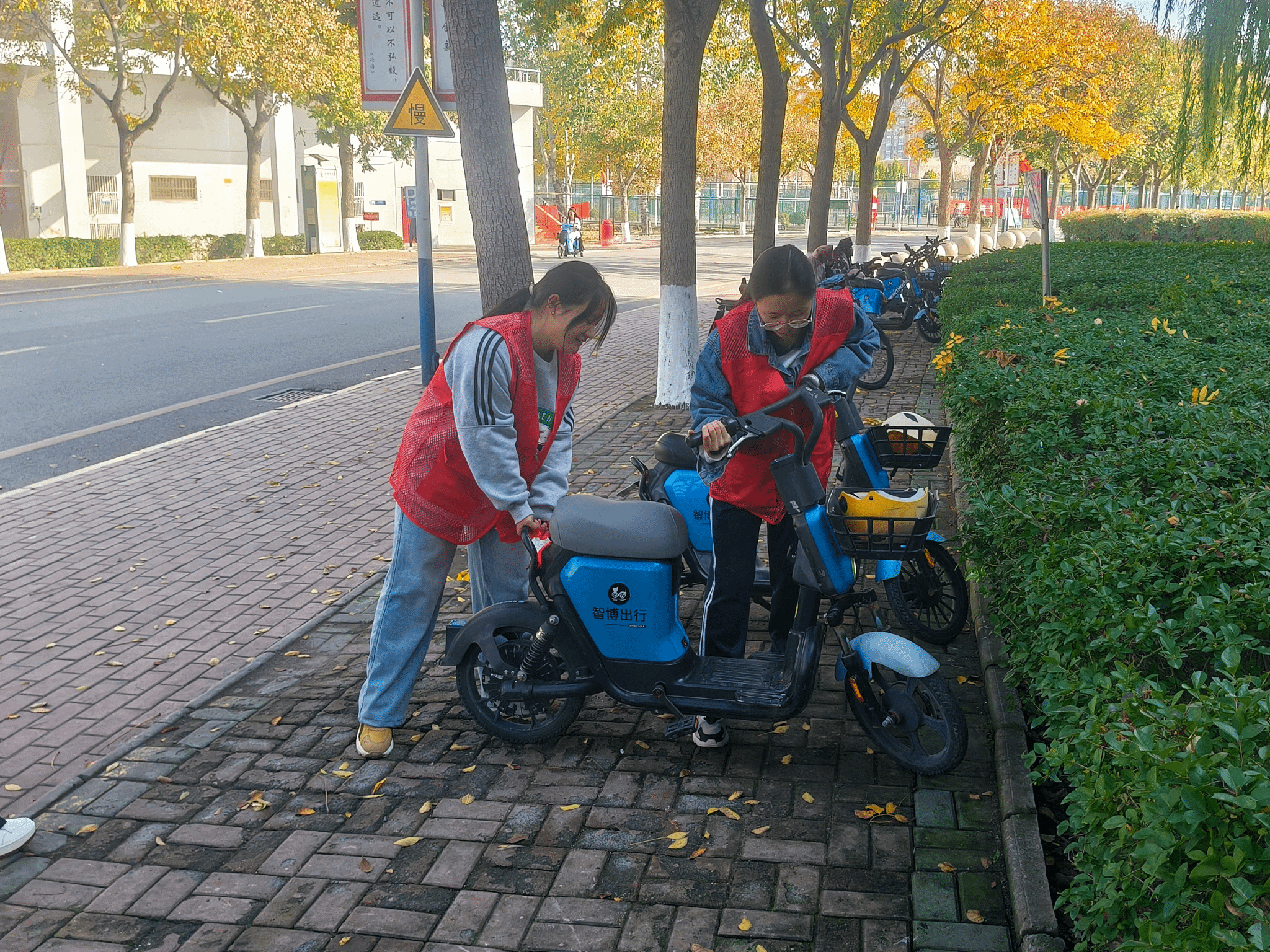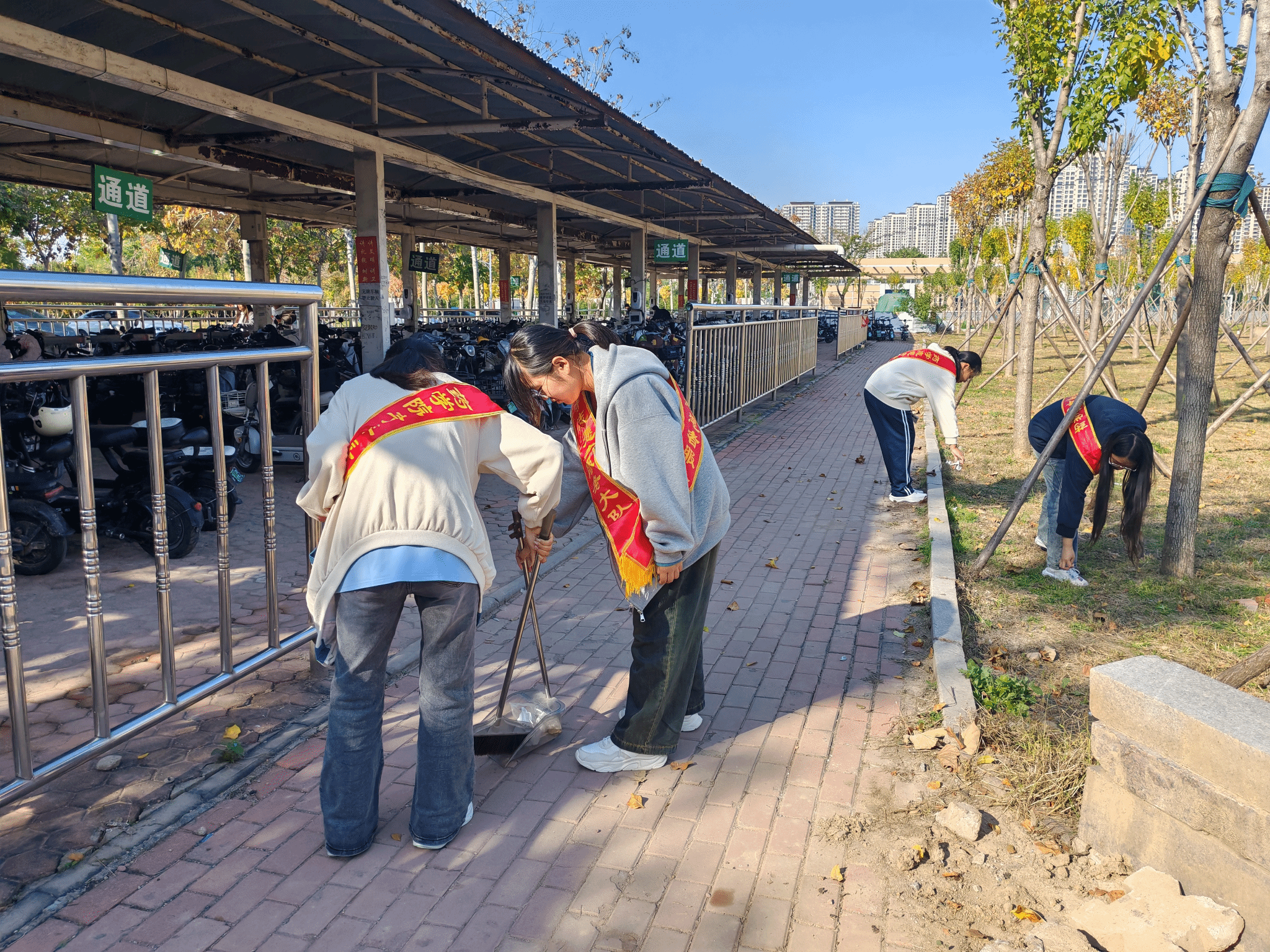 活动开始前,志愿者队伍于9号楼404教室完成集结。在负责人明确任务分工后,志愿服务迅速展开。在校园各处,志愿者们化身“环境守护者”:面对随意停放的共享单车,他们俯身扶正车身,合力将车辆规整至指定区域,以统一朝向、笔直排列的标准,让校园道路重归清爽;面对散落的树叶与纸屑,志愿者手持扫帚高效清扫,用簸箕将垃圾运至垃圾桶,每一个动作都彰显着责任与担当,用汗水为校园洁净注入力量。经过几个小时的通力协作,校园环境焕然一新,志愿者们的奉献身影也成为校园中一抹亮眼的文明底色。