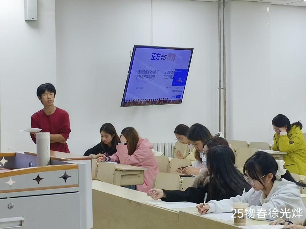 本次辩论赛抽签决定对手与辩题的正反方。比赛前夕,辩手们分工查资料、反复磨合论点。比赛现场,他们引经据典、逻辑缜密,既有默契十足的团队协作,又不乏独到犀利的个人见解,凭借扎实的专业素养与灵动的辩论技巧,将观点碰撞的精彩瞬间展现得淋漓尽致。现场气氛紧张而又热烈,清晰的论证思路与流畅的语言表达得到了观众的阵阵掌声。