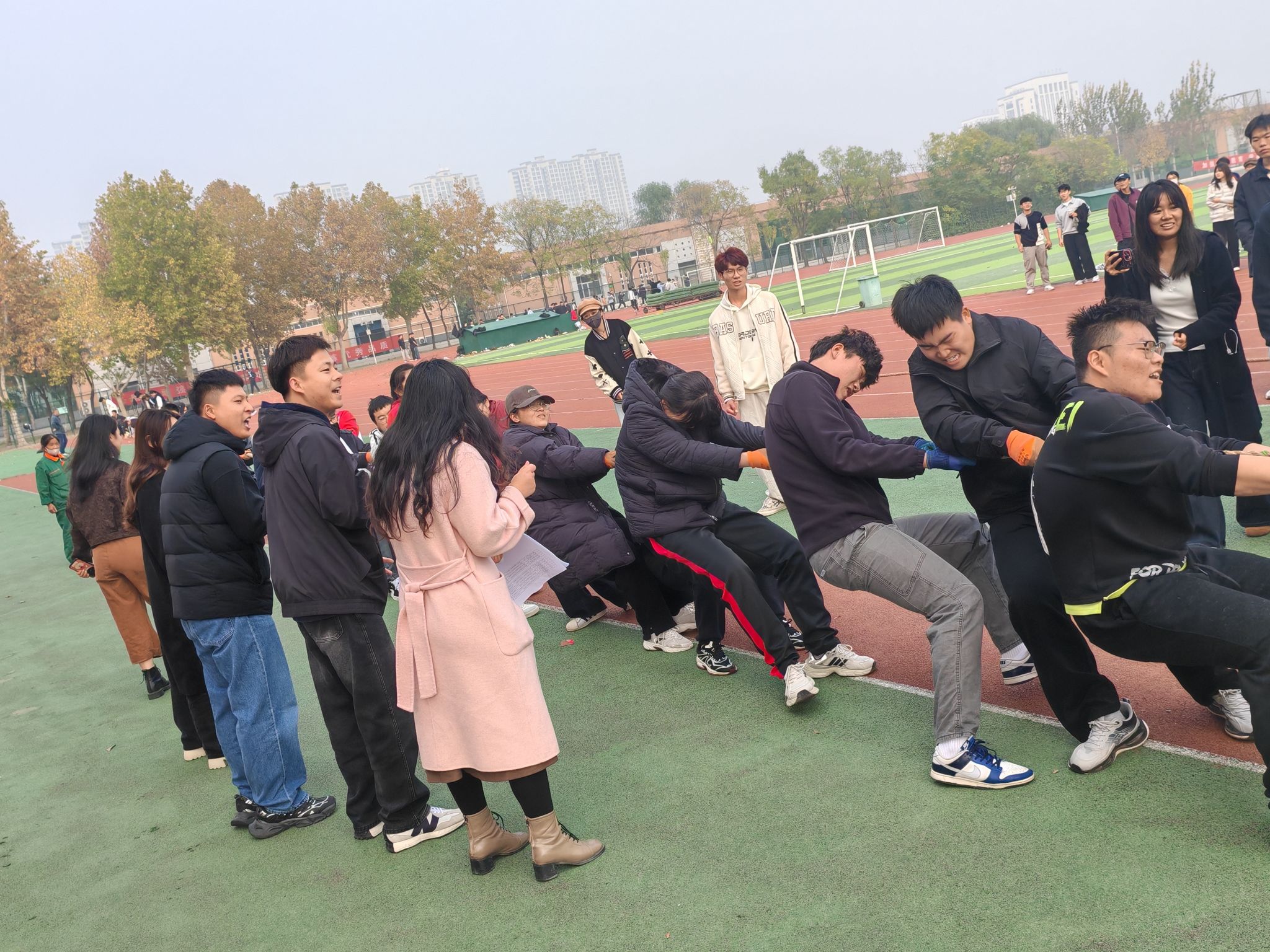 哨声划破长空,比赛瞬间燃爆全场。对阵双方倾身发力,紧攥长绳,足底生根,在一次次节奏鲜明的集体角力中展开拉锯。标志胜负的红布条每一次偏移,都引动全场心跳,此起彼伏的呐喊助威声浪,将赛场气氛不断推向高潮。这是一场力与美的交响,学子们用汗水诠释团结,用激情点燃了整个田径场。