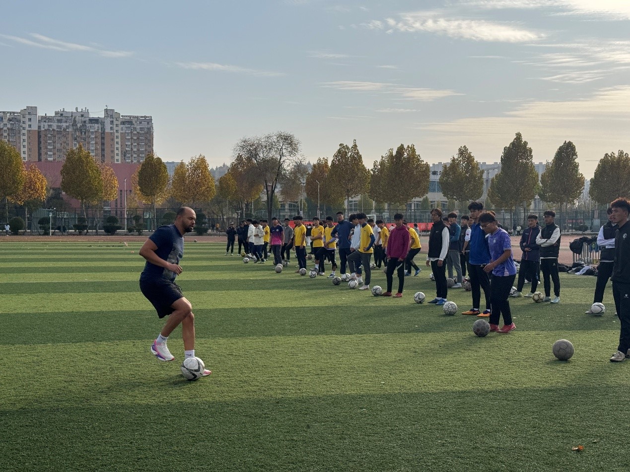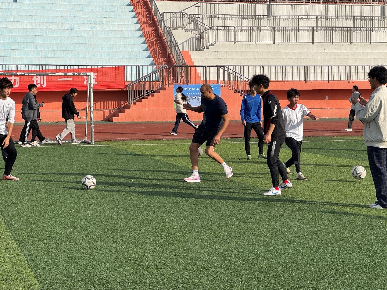 本次交流活动以一节生动的足球教学课程形式呈现。主讲人艾伦教授亲自为同学们讲解并示范足球技术动作,引导同学们开展实践操作。在同学们练习期间,艾伦教授进行细致观察,并及时开展一对一指导,助力同学们掌握技术要点,使动作达成更高的准确性与规范性。体育与健康学院教师康博博士全程担任翻译工作,精准传达艾伦教授的教学意图与专业指导意见,保障了交流活动的顺畅与高效,让同学们能够无障碍地进行练习与理解。