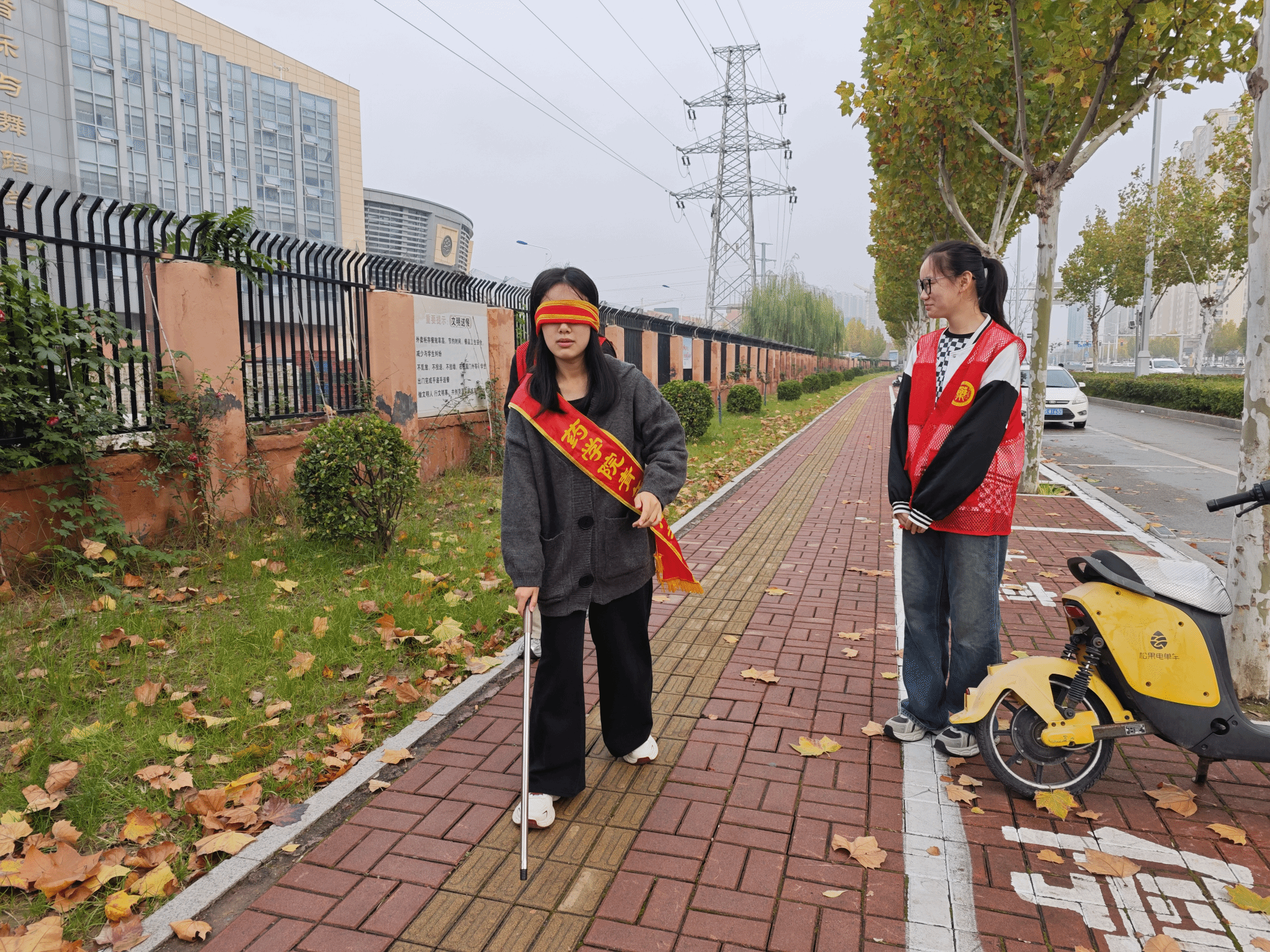 活动伊始,学生志愿者迅速分组、明确分工,手持工具有序行动:弯腰俯身捡拾盲道及周边杂物垃圾,耐心劝导车主规范停车、挪离盲道,细致规整散落物品,齐心协力为盲道“清障”,让原本堵塞的通道逐渐恢复畅通。清理工作结束后,“盲道体验挑战”随即开展,同学们依次蒙眼踏上盲道行走,在视觉受限的环境中步步谨慎,切身体会视障人士出行的不便与不易。整场活动在“畅通盲道,从我做起”的口号中圆满落幕。