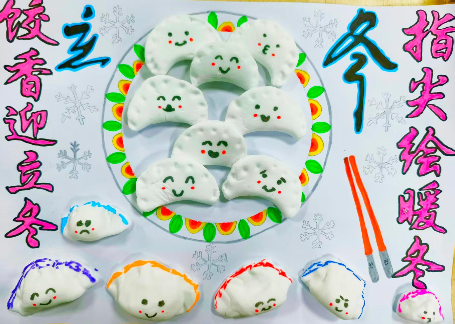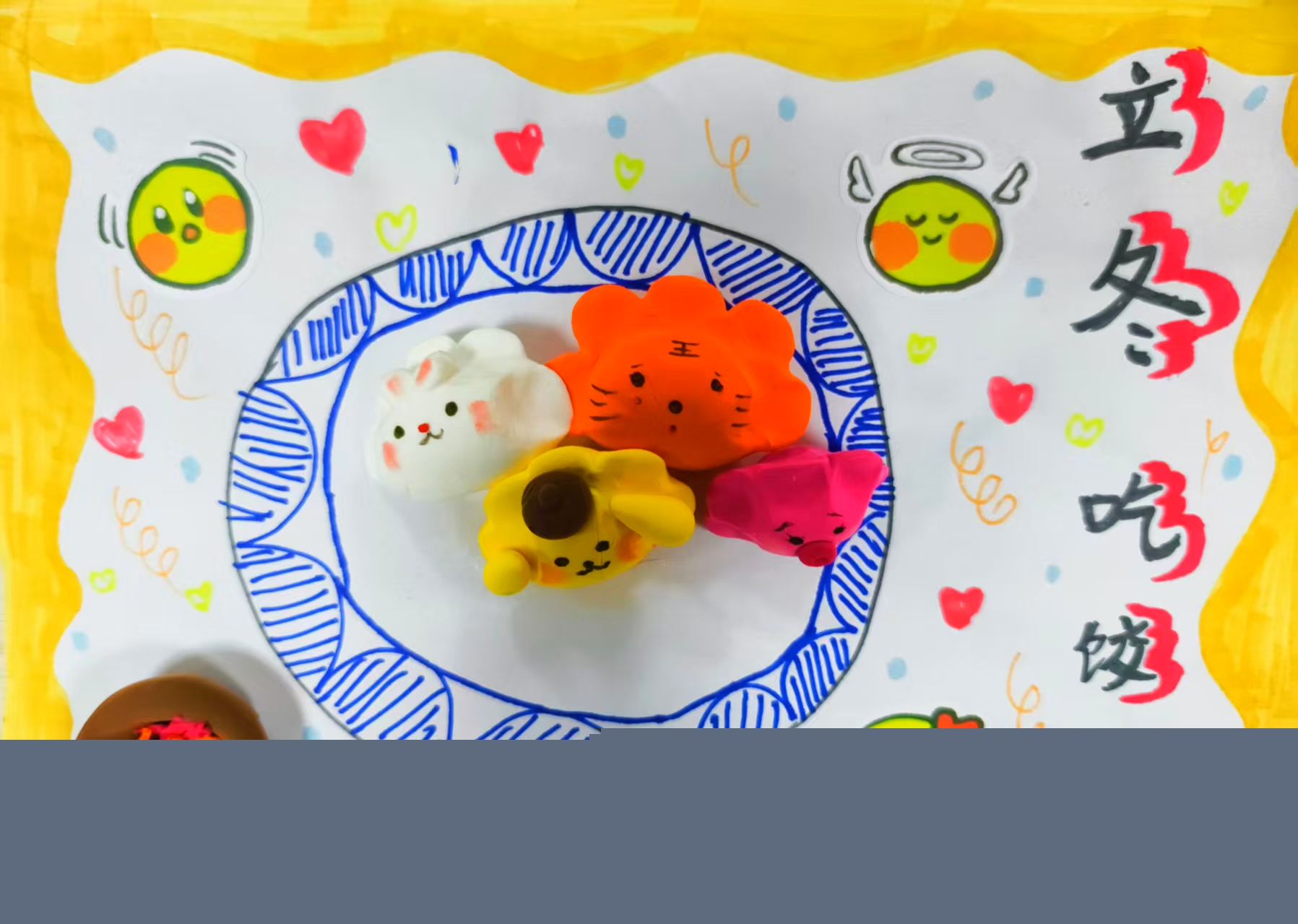 活动期间,同学们以立冬节气为核心展开创作:用卡纸绘制温馨背景,勾勒花纹精致的餐盘与飘着热气的桌布,点缀“立冬”字样与雪花元素;用超轻粘土捏制立体饺子,并赋予其微笑、眨眼等生动表情,以红、黄、橙等暖色调为主色,搭配饺子叶,营造出“餐桌围坐”的温暖氛围。作品融入“立冬吃饺子”的民俗内涵,将“家庭团聚”的传统内核与“校园温情”结合,让手工作品兼具观赏性与文化感。最终,李国宁、杨晨希等五位同学凭借新颖的创意构思与精致的制作工艺,荣获本次活动一等奖。