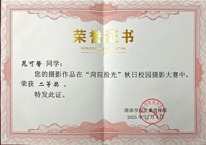 近日,由菏泽学院党委宣传部主办的“菏院拾光”秋日校园摄影大赛圆满收官,单县分校学生晁可馨的作品《校园秋语》凭借对秋日景致的独特诠释与扎实的摄影功底脱颖而出,荣获学生组二等奖,用镜头为分校赢得了荣誉。