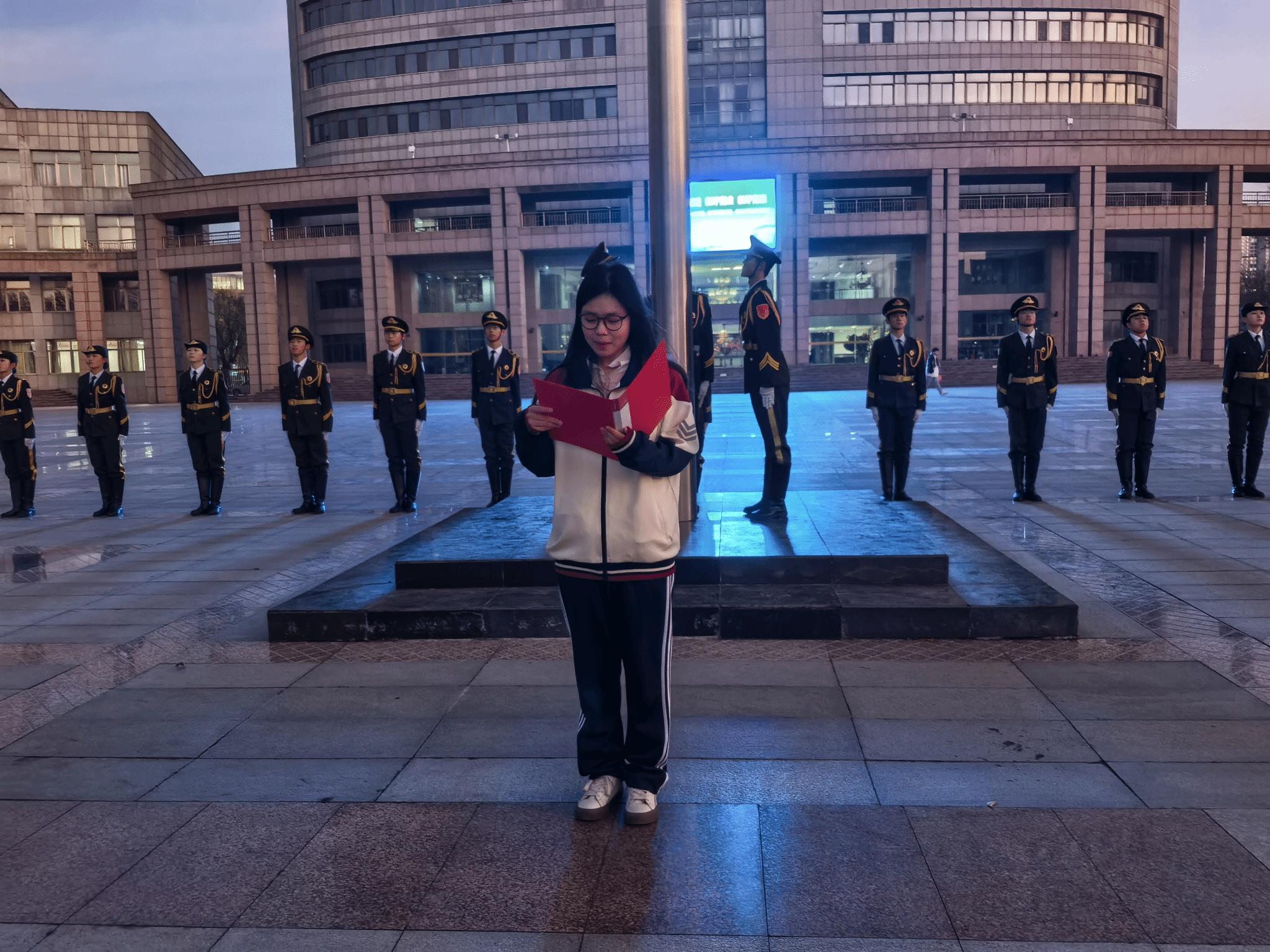 6点40分,教师教育学院学子伴着清晨的微光,以班级为单位整齐列队于国旗杆下,全场庄重,静候国旗升起。随着洪亮有力的指令,国旗护卫队迈着沉稳整齐的步伐,昂首挺胸护送国旗至升旗台。旗手振臂扬旗,鲜艳的五星红旗缓缓升空,迎风舒展,学子们神情肃穆,庄严行注目礼。升旗礼毕,2025级特殊教育专业本科班的宁夏以“让爱国之心在行动中闪光”为题发表演讲,呼吁同学们以赤诚赴使命,以行动践爱国,深耕专业、勇担使命,尽显青年学子的爱国热忱与奋进姿态。