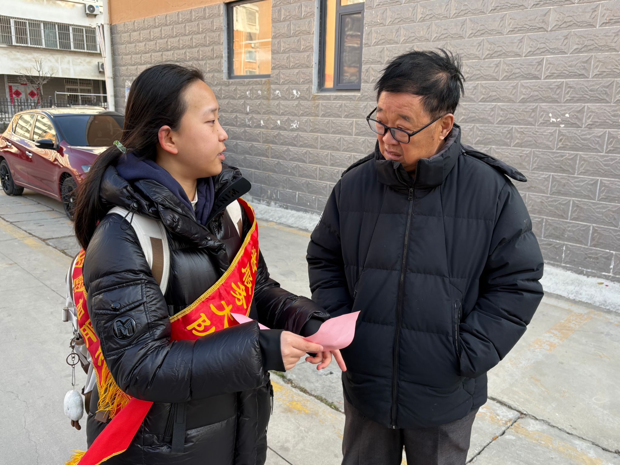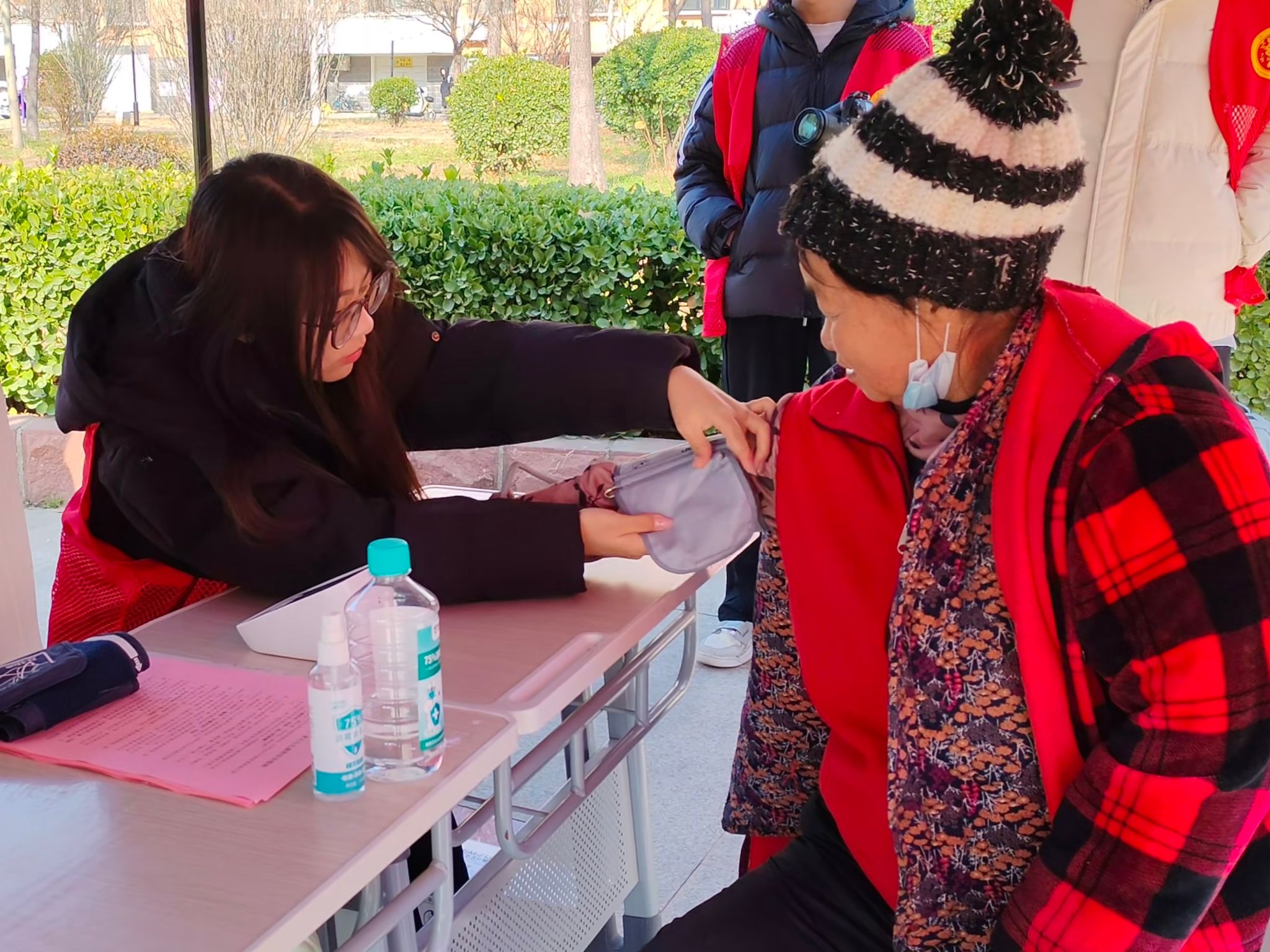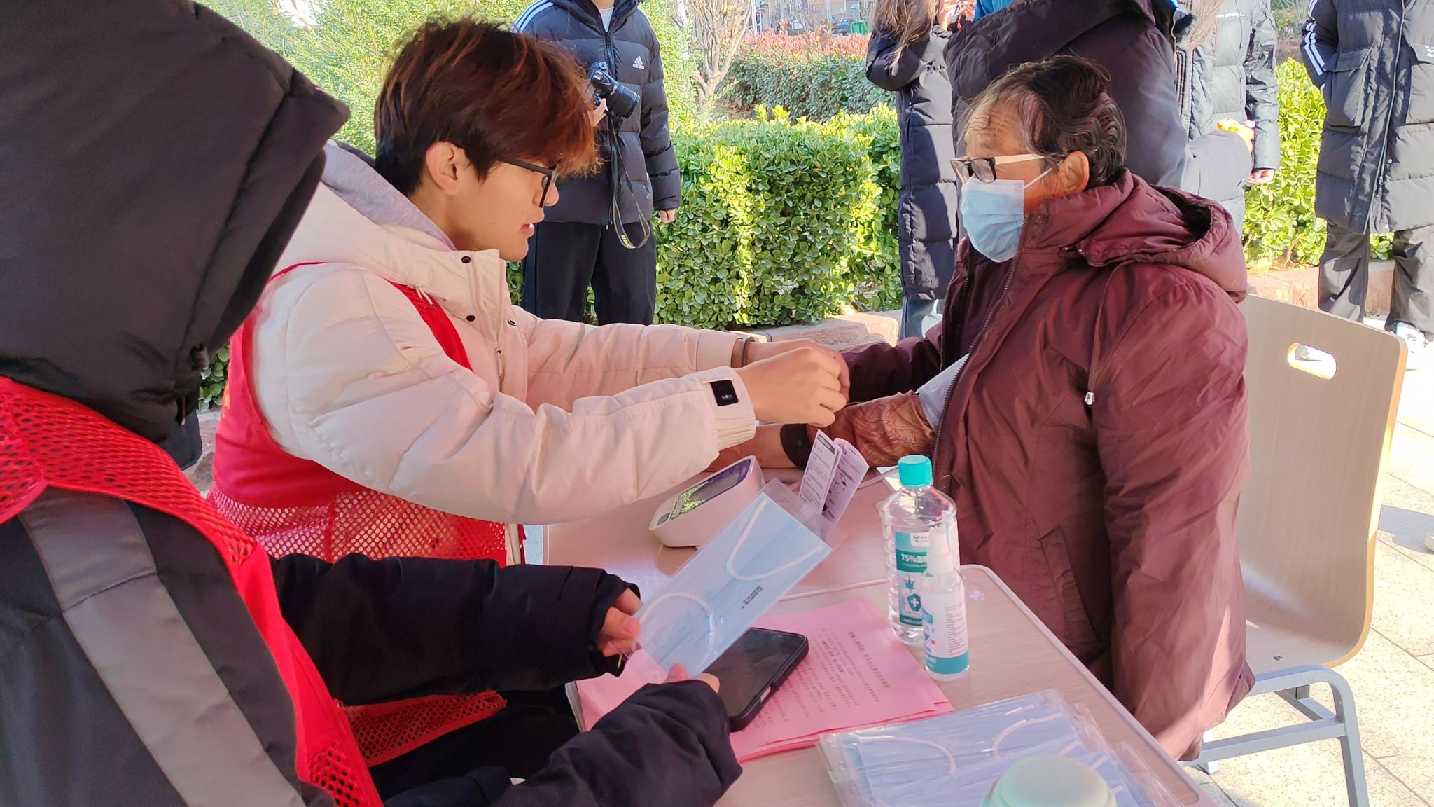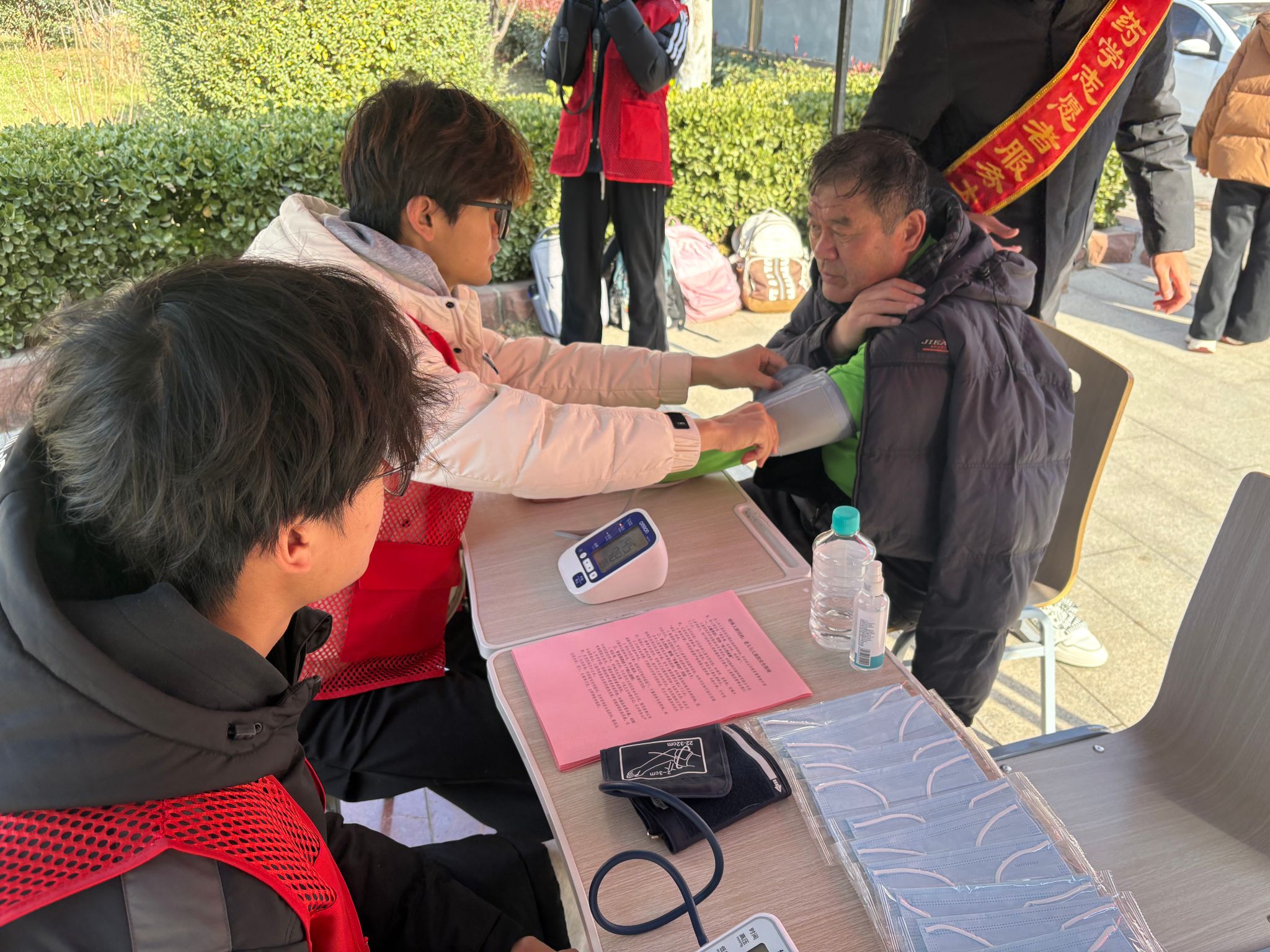 活动现场,志愿者们分工协作、有条不紊,围绕居民冬季健康防护需求,构建起“健康检测+科普宣讲+实操教学+便民服务”一体化志愿服务体系,将专业知识转化为居民易懂易用的健康保障举措,让志愿服务既有专业深度,更有民生温度。 在血压检测区,志愿者们熟练操作电子血压计,为到场居民提供免费测量血压服务,详细记录每一位居民的检测数据并清晰标注正常血压范围。针对血压异常情况,志愿者结合专业知识耐心叮嘱就医注意事项,以严谨态度为居民排查健康隐患。