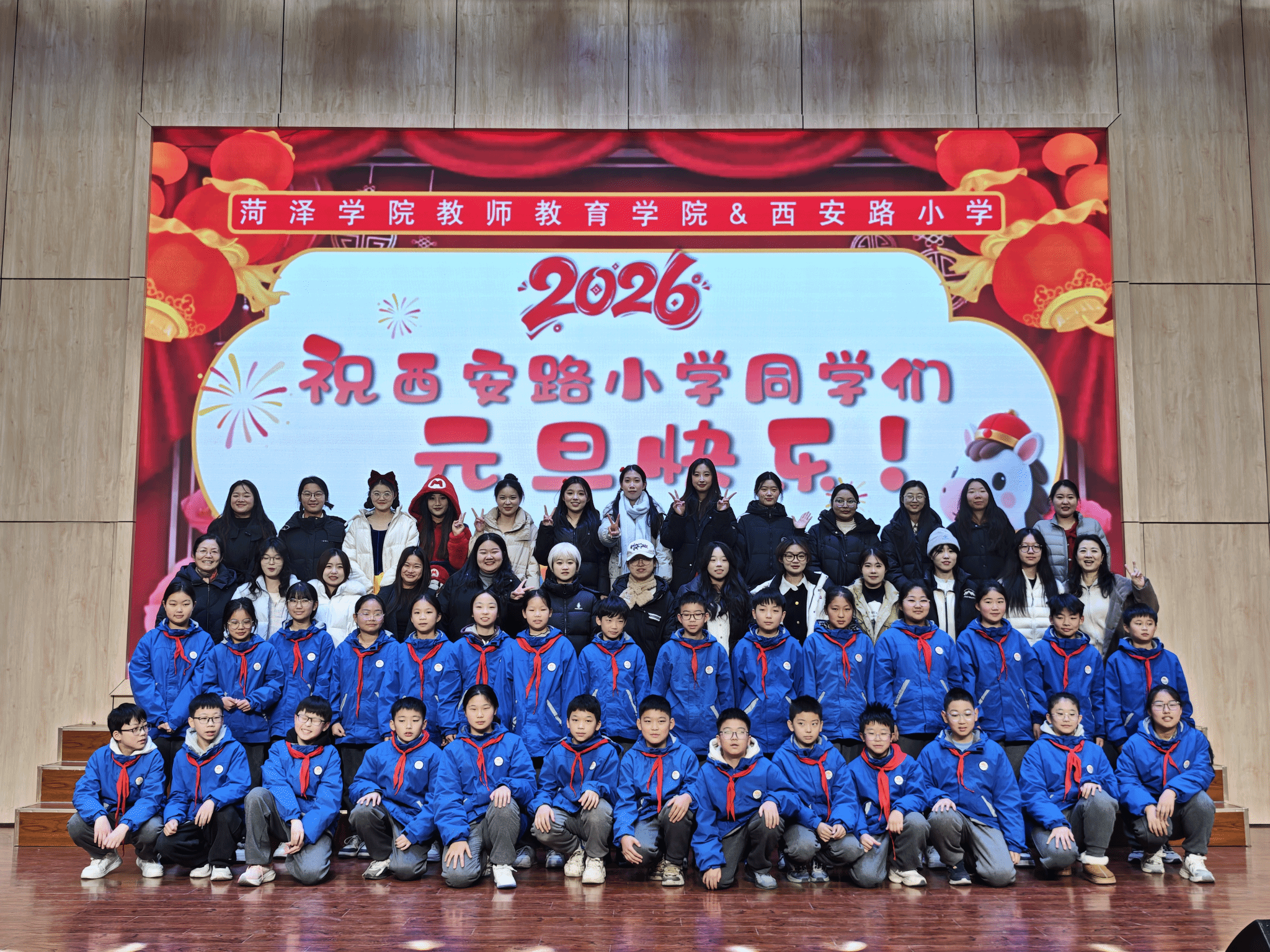 为喜迎2026年元旦,12月31日,教师教育学院与牡丹区西安路小学联合举办“大手牵小手,‘艺’起迎元旦”联欢活动。小学教育系党支部书记、系主任李靖、摘星戏剧工作坊指导老师刘雪芹带领摘星戏剧工作坊成员,与牡丹区西安路小学校长陈绪英及师生代表同台互动,为孩子们勾勒出一场满是艺术与欢乐的元旦记忆。