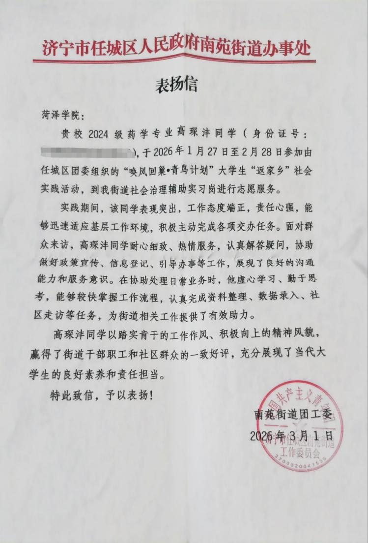 近日,药学院2024级药学班的高琛沣在大学生“返家乡”社会实践活动中表现突出,获得实践单位表彰。寒假期间,高琛沣同学积极响应学校与学院号召,在济宁市任城区南苑街道办事处社会治理辅助实习岗开展实践服务,凭借扎实作风与责任担当得到实习单位的高度认可与充分肯定。