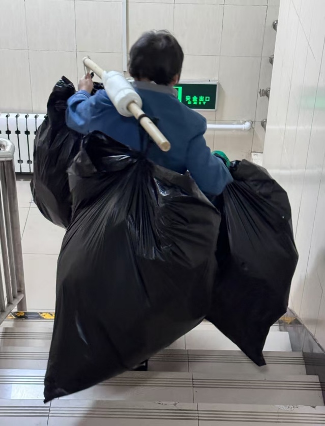 阿姨用最朴素的工具承担着繁重的清洁工作,用日复一日的辛劳维护着校园的整洁,这是最贴近我们生活的“雷锋式”奉献。她的背影没有豪言壮语,却用行动诠释着“服务他人、默默付出”的雷锋精神,是校园里最容易被忽略却又不可或缺的微光。沉甸甸的垃圾袋与她单薄的背影形成鲜明对比,让我们直观感受到基层劳动者的不易,也唤起了对身边平凡善意的感恩与敬意。